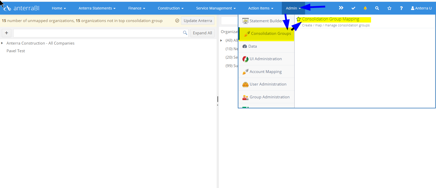 Consolidation Groups are accessed from the Admin menu; navigate to "Consolidation Groups" and "Consolidation Group Mapping".