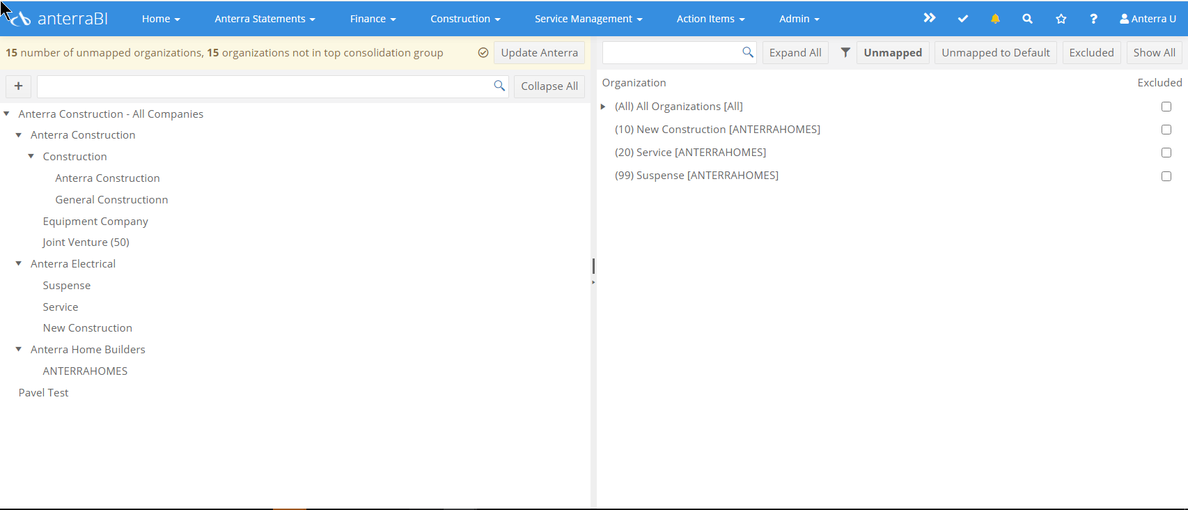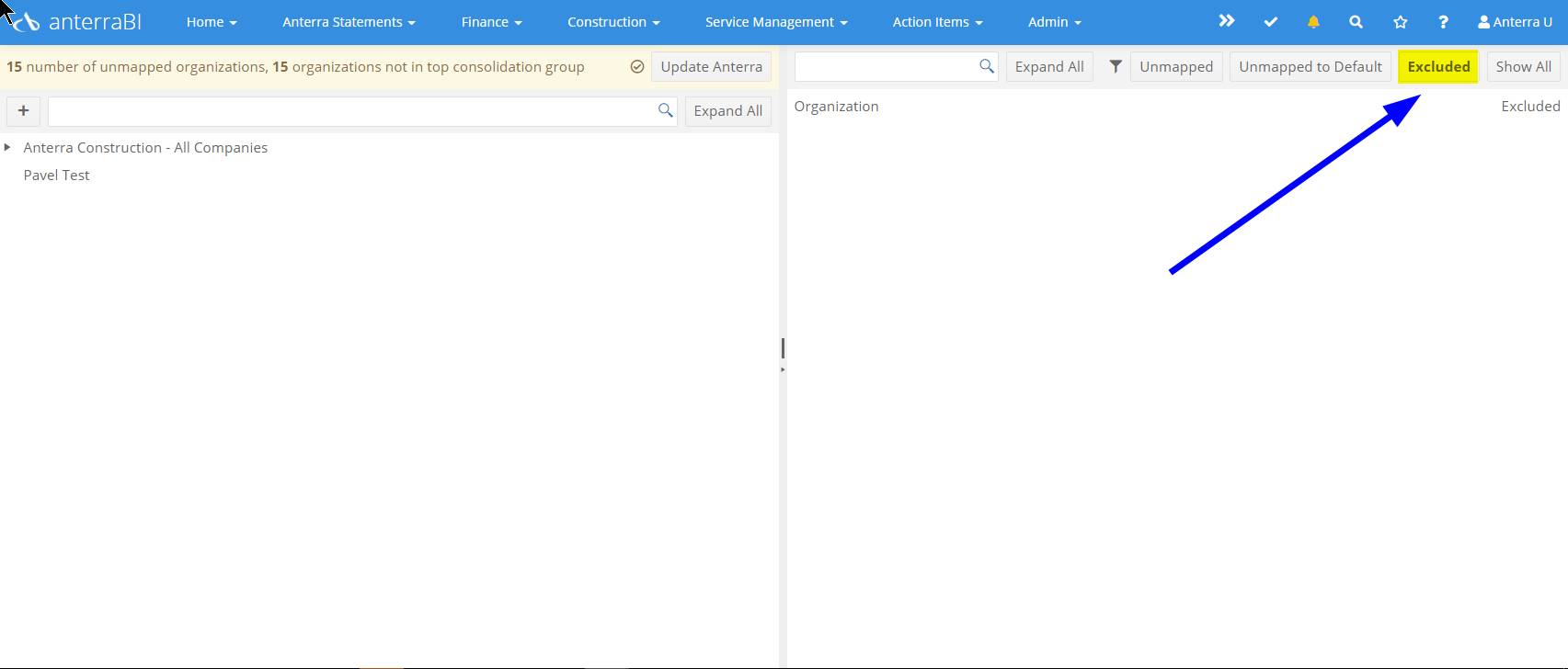 "Show All" displays all consolidation groups contained within AnterraBI™.