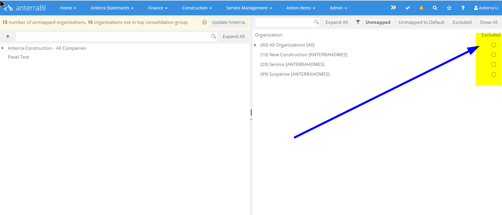 Consolidations may be "Excluded" by checking the box in the "Unmapped" Consolidations view.