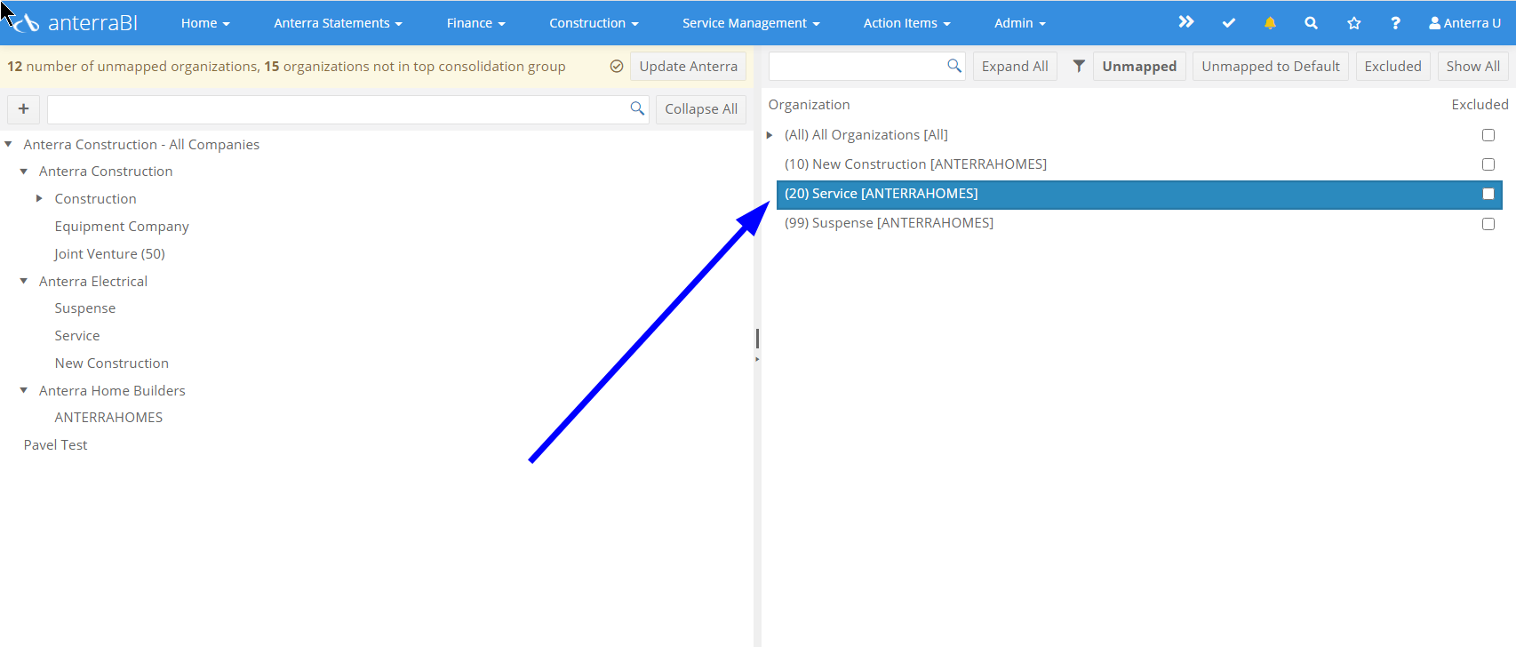 The amount of "Unmapped" organizations and the amount of organizations that are not in the top consolidation group is displayed in the upper left-hand side of the screen.