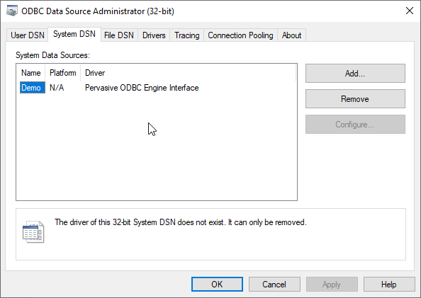 Open ODBC Data Source Administration (32-bit) from the Windows Search by typing in odbc. Once open go to the System DSN tab. It will look like the below image.