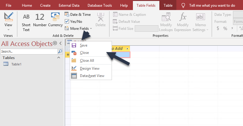 Once your new Access DB is open, close the table it opens by default by right clicking on the tables tab and selecting Close from the dropdown. It will look like the below image.