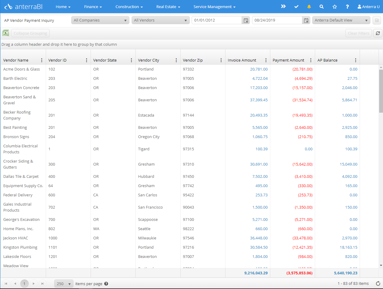 Purpose: Review invoices and payments by vendor over a range of dates. This grid replaces an SSRS Report with pivot grid technology.